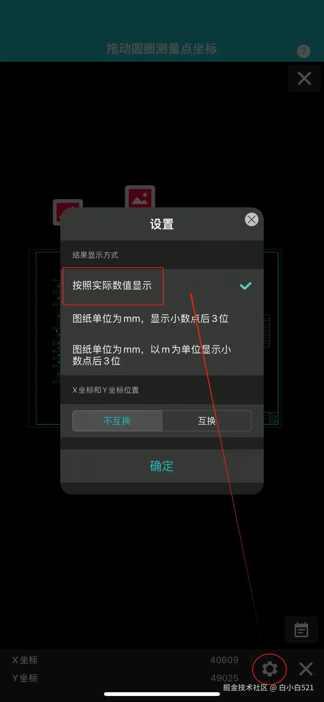 打开浩辰CAD看图王APP,点击【测坐标】,点击页面下方齿轮按钮,切换至 “按照实际数值显示” 即可(另外两个结果显示方式可根据您的具体需要进行调整)。
