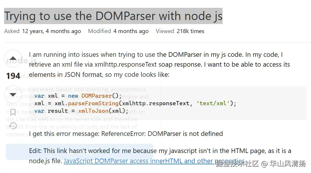 我在 StackOverflow 上看到这个帖子:[Trying to use the DOMParser with node js](stackoverflow.com/questions/1…)