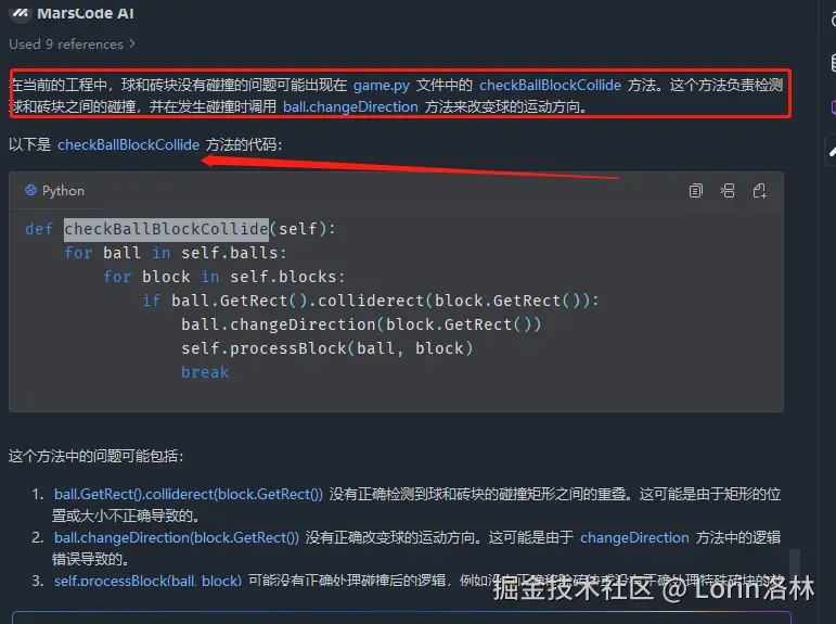 - 我们发现 MarsCode AI 同样没有给我们正确代码,简单分析代码发现错误可能是在