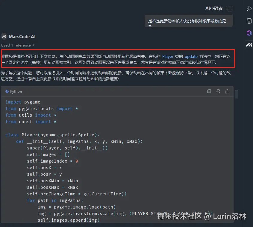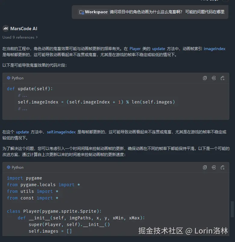 是不是更新动画帧太快没有限制频率导致的鬼畜,这一次 MarsCode AI 成功的解决了问题,提供了正确的修复代码。