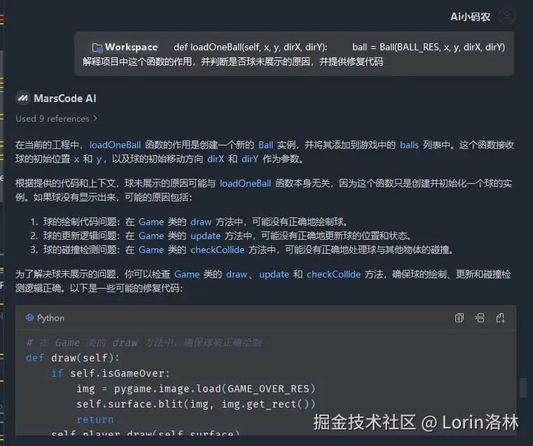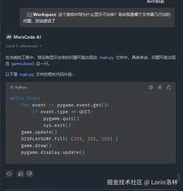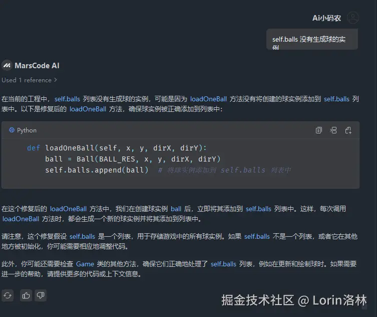 - 结合分析和断点我们发现 balls 列表中没有生成球的实例,再次把补充资料提供给 MarsCode AI ,这一次 MarsCode AI 完美的解决了问题。