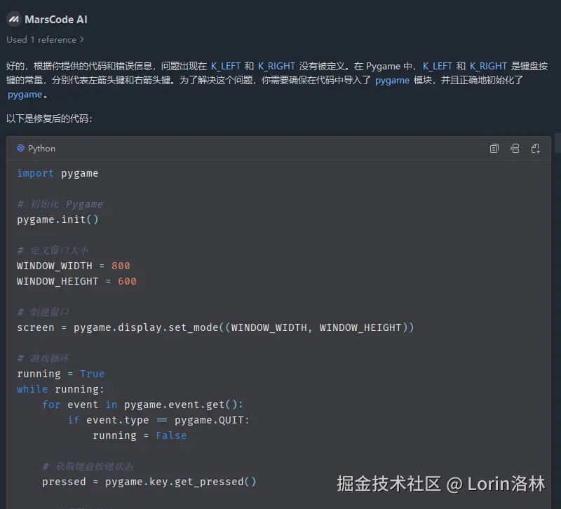 - 此时此刻我灵机一动,再次问了开头的那一句提示语,发现 MarsCode AI 正确的给我解决了问题,难道?心里埋下了一个小小怀疑种子,当然也有可能是偶然,为了验证猜想,继续复现后面的问题。