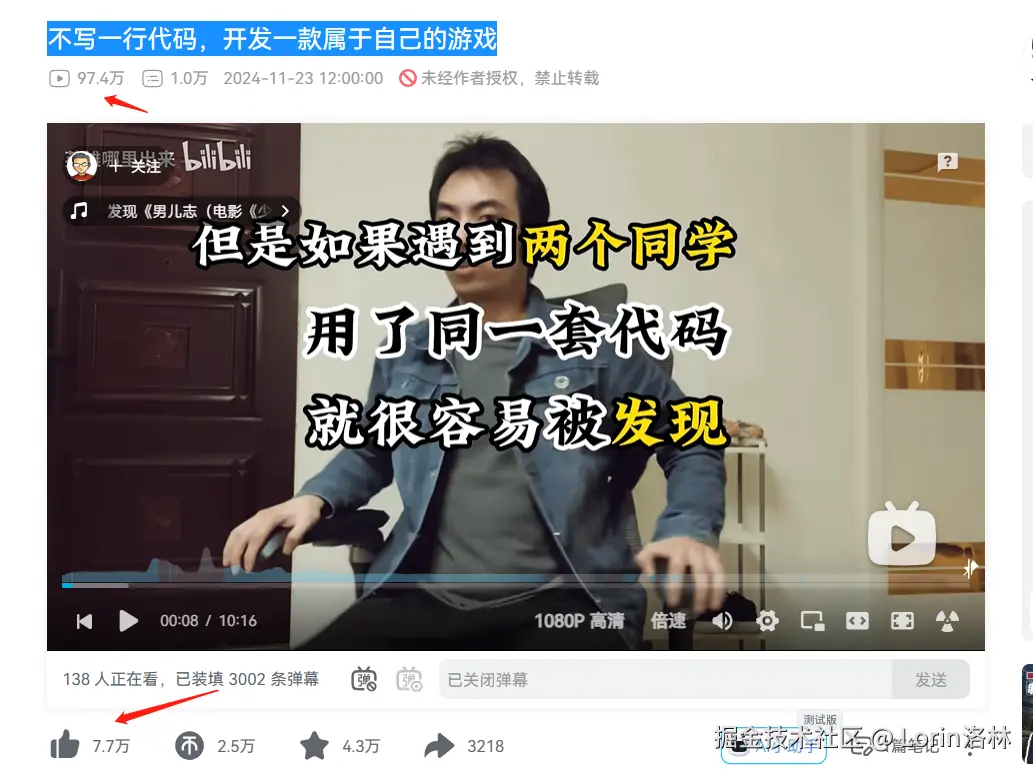英雄哪里出来发布的一个视频 :不写一行代码,开发一款属于自己的游戏,我们可以看到这个视频接近百万播放,8万点赞,想必具备一定的参考意义。