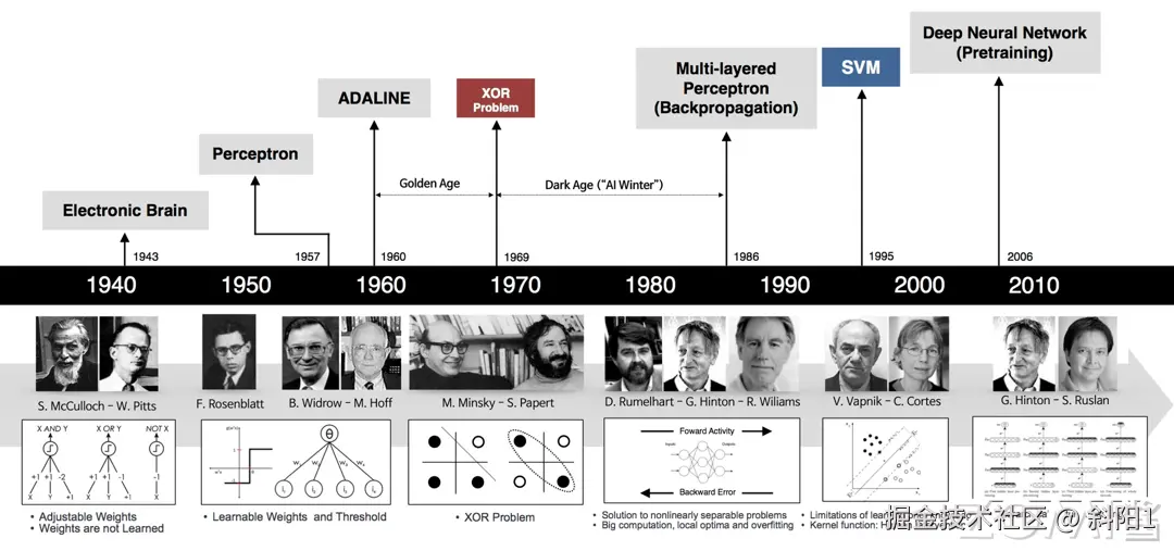 虽然 AI 在今年取得了举世瞩目的进展与突破,但是其当前基于的核心理论神经网络等,在这波浪潮开始前已经基本奠定,并经历了多次的起起伏伏。神经网络作为 AI 的前身,经历了以下的发展阶段: