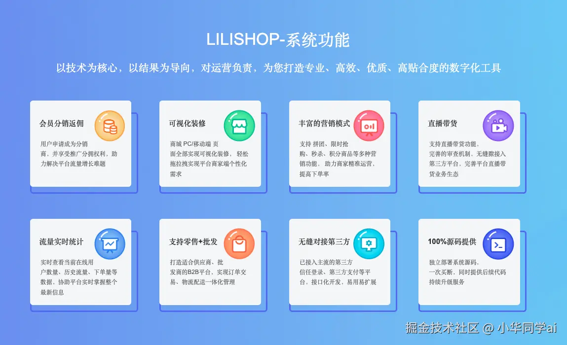 - 企业电商平台:Lilishop可以帮助企业快速搭建自己的电商平台,提升品牌形象,拓展销售渠道。
