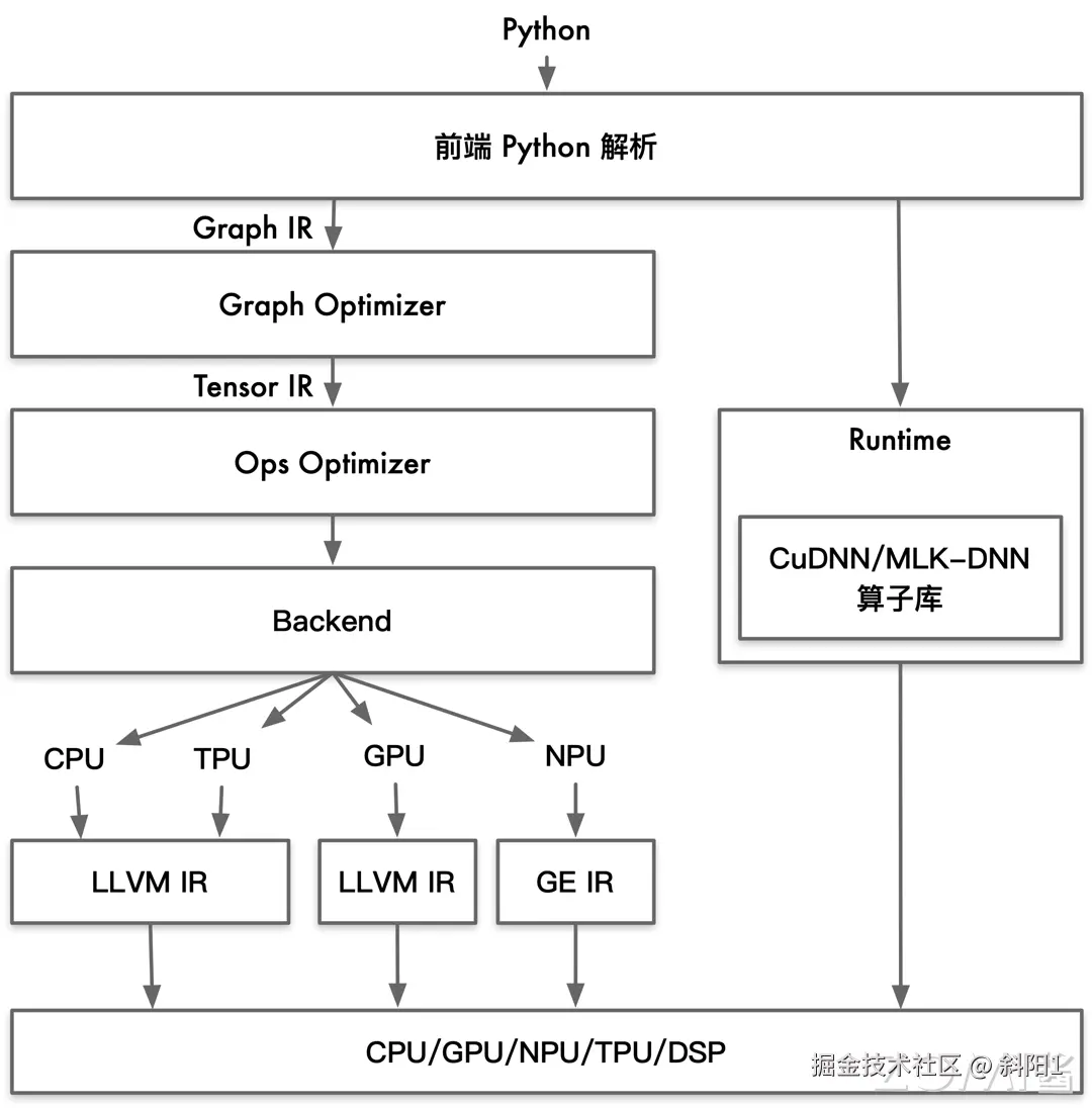 软件栈结构类似:它们都分成前端、优化、后端三段式,通过 IR 解耦前端和后端使得可以进行模块化表示。