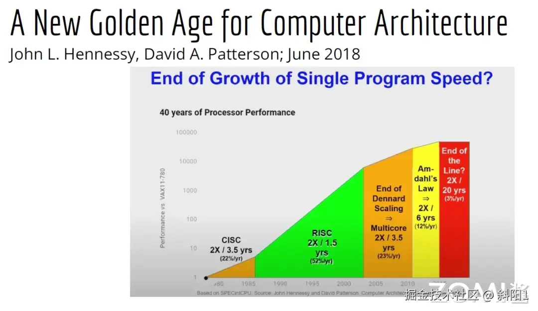 图灵奖获得者 David Patterson 在 2019 年 5 月发表了一个名为“计算机架构新的黄金年代”的演讲,他通过回顾自 20 世纪 60 年代以来的计算机架构的发展,来介绍当前的难题与未来的机遇。他预测未来十年计算机架构领域将会迎来下一个黄金时代,就像 20 世纪 80 年代一样。