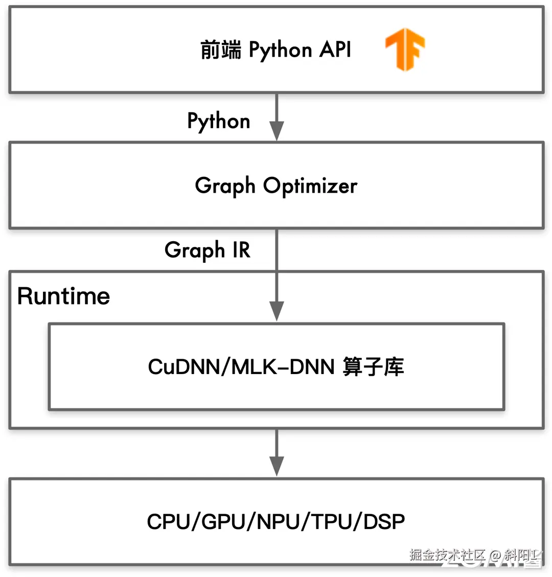如下图我们可以看到 TensorFlow 早期的实现,就是通过调用一些通用性的优化算子库(如 MKL-DNN 和 CuDNN)实现高效计算的。