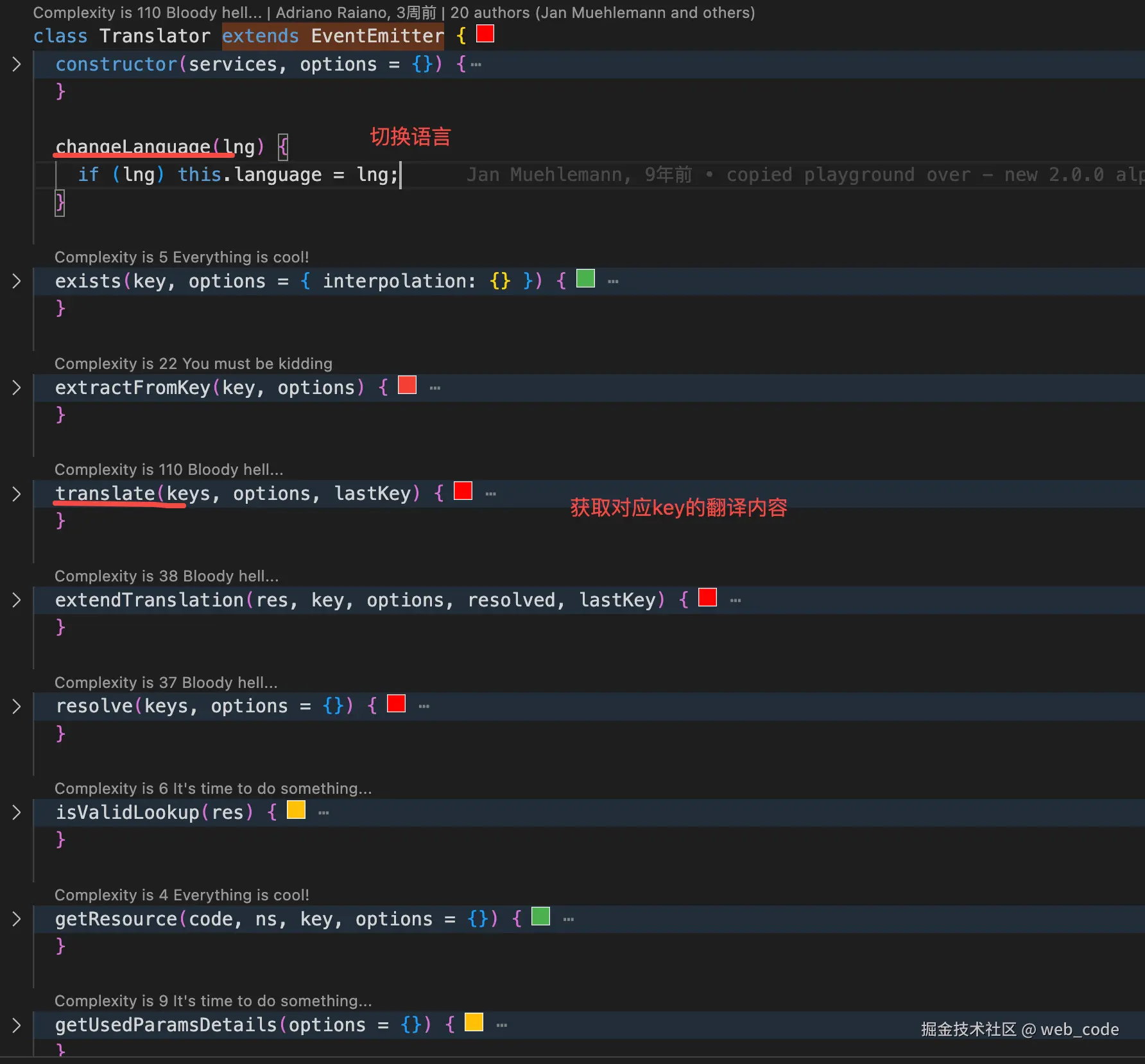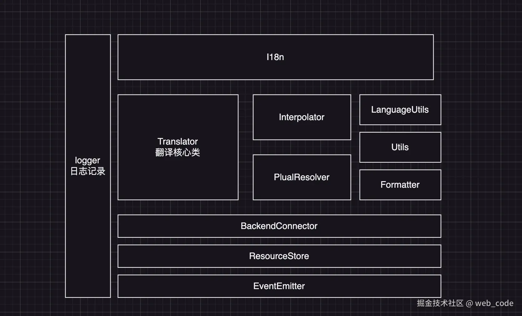 - EventEmitter.js:内部就是一个常规的观察者模式,内部维护了on, off, emit钩子函数; 其他I18n,Translator, ResourceStore, Connector类都是继承了EventEmitter类;