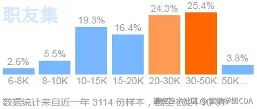 根据职友集工资查询显示,来自近一年的3114份样本统计,上海数据分析师平均工资24200/月,其中月收入20000元-50000元占比最多,达49.7%。(下图是上海数据分析师工资占比)