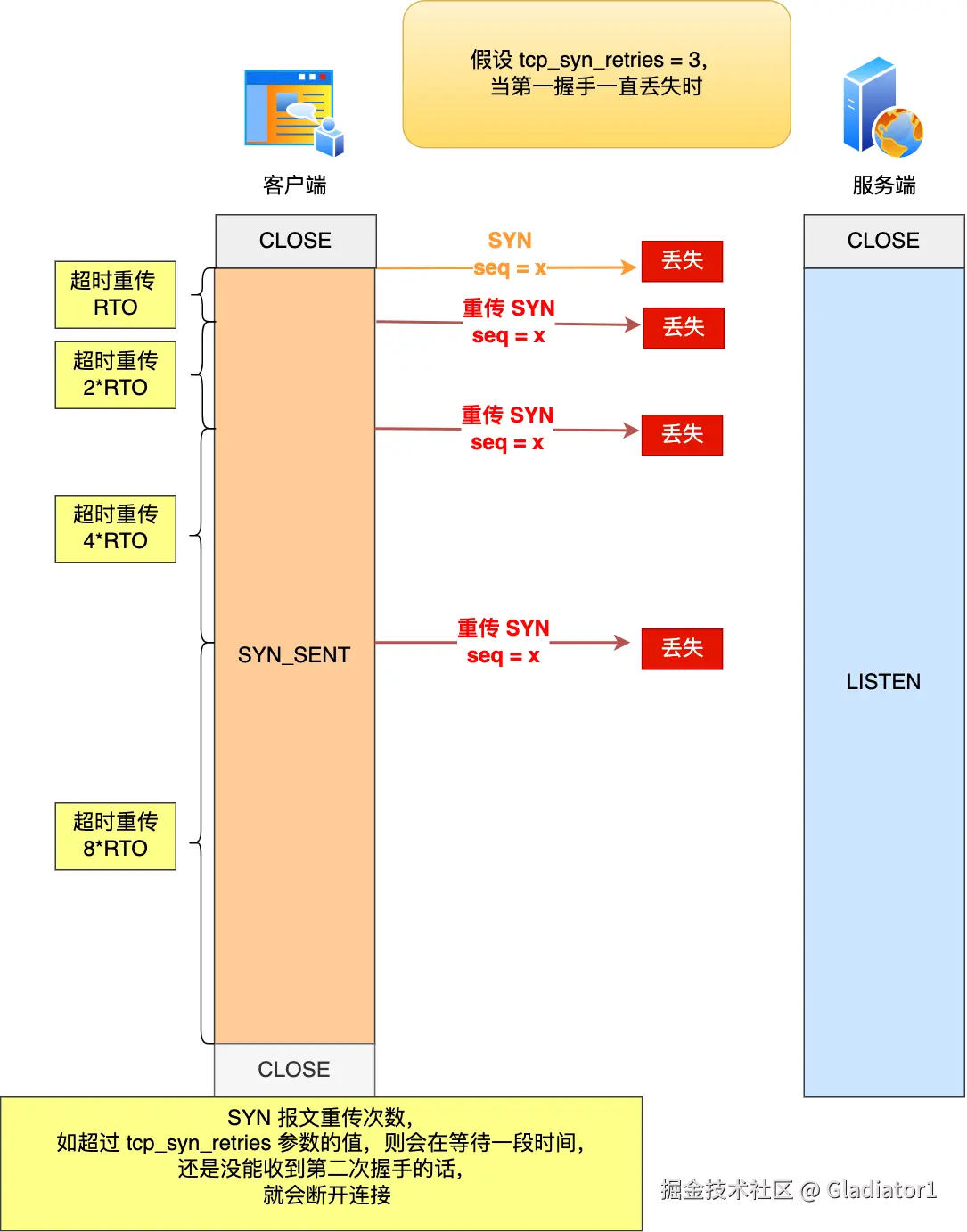 举个例子,假设 tcp_syn_retries 参数值为 3,那么当客户端的 SYN 报文一直在网络中丢失时,会发生下图的过程:
