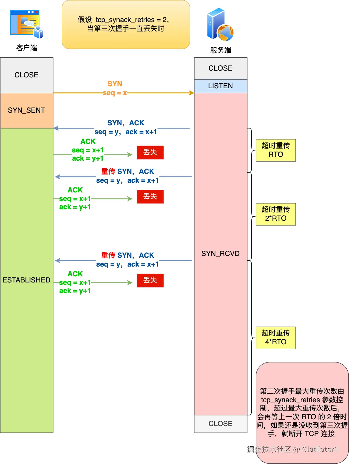 举个例子,假设 tcp_syn_retries 参数值为 1,tcp_synack_retries 参数值为 2,那么当第二次握手一直丢失时,发生的过程如下图: