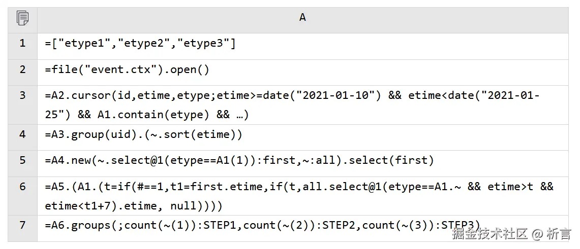 我们再来看一下前面提到的电商漏斗例子实现,来感受 SQL 和 SPL 的不同。