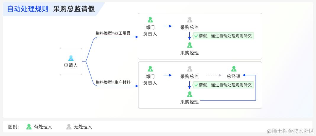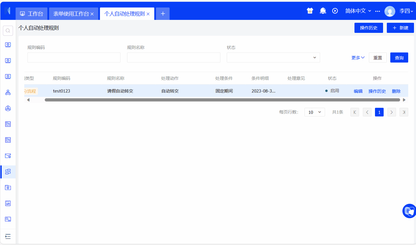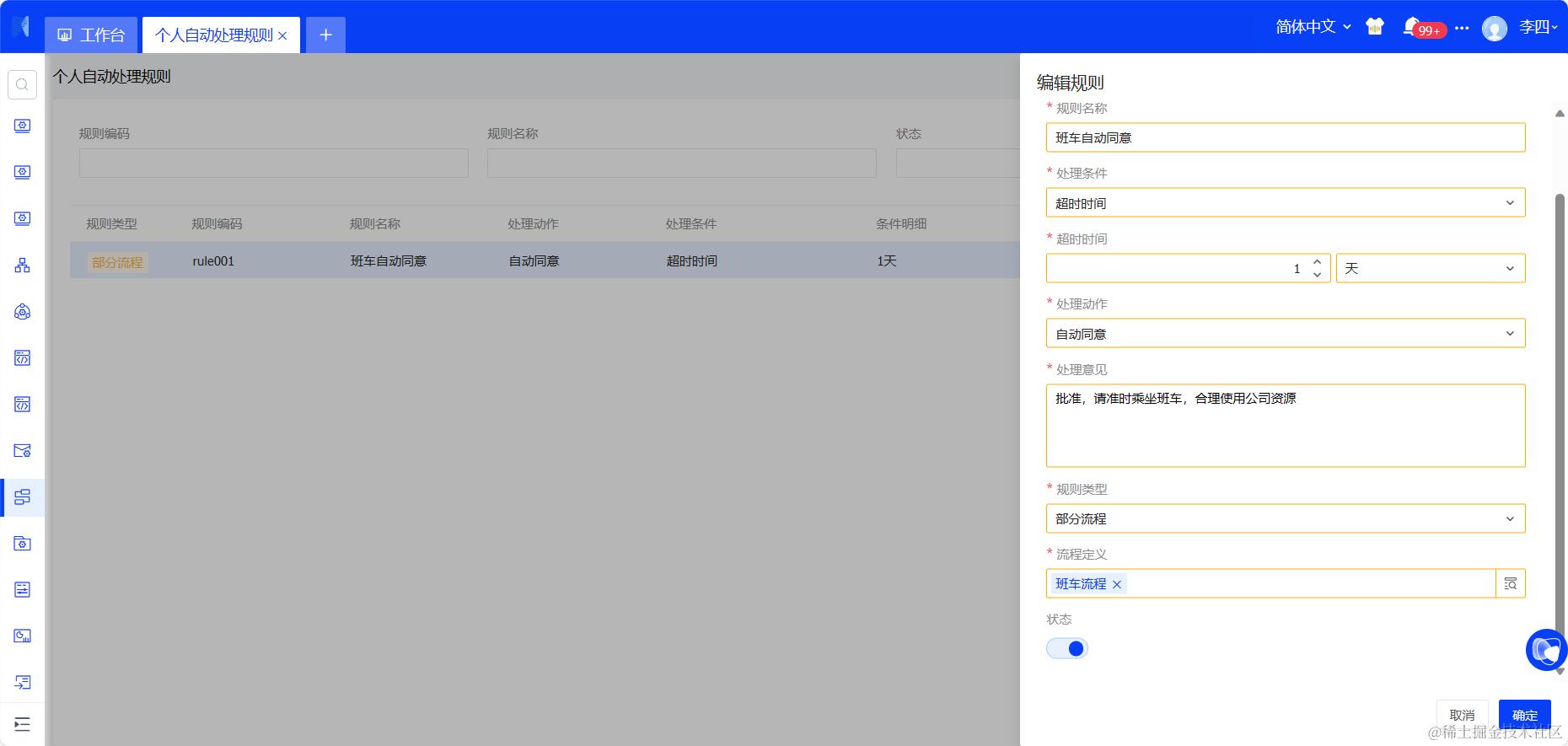 个人自动处理规则是通过维护当前用户的自动处理规则,系统自动处理指定时间内/超过一定时间未审批的待办。