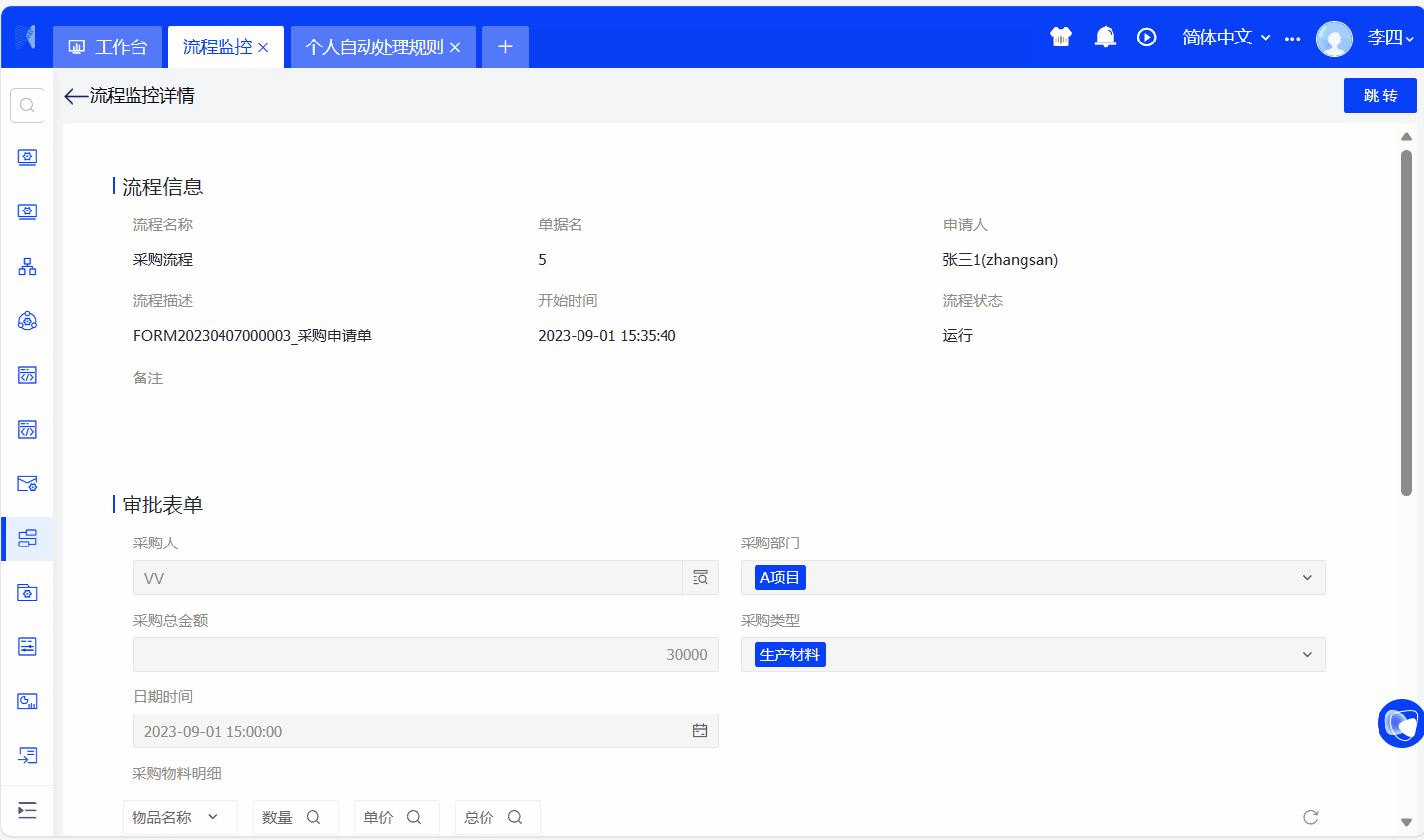 在2023年8月31日到9月3日采购总监-李四请假期间,李四关于采购类型流程的待办任务转由采购经理-周六进行审批。周六审批完成后,流程流转到后续节点审批人,极大提高了审批效率。