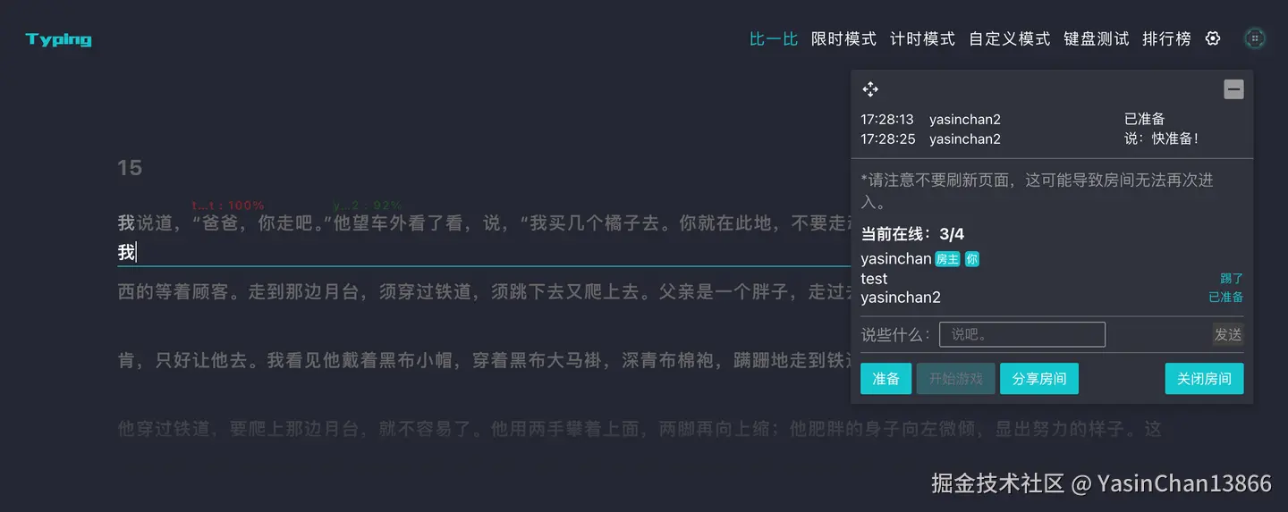 因为本项目已经完成,我们就直接根据完成好的内容进行逆向分析。正如 typing.yasinchan.com/game 所见,整个游戏过程包括设置配置进行创建,创建完成后可以邀请用户或者用户通过房间列表加入房间。这意味着需要同时存在很多房间。