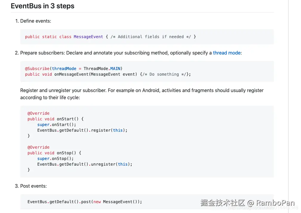 - 增加一个处理该消息的方法,传入参数类型为上一步定义的事件类。并且增加 @Subscribe 注解。