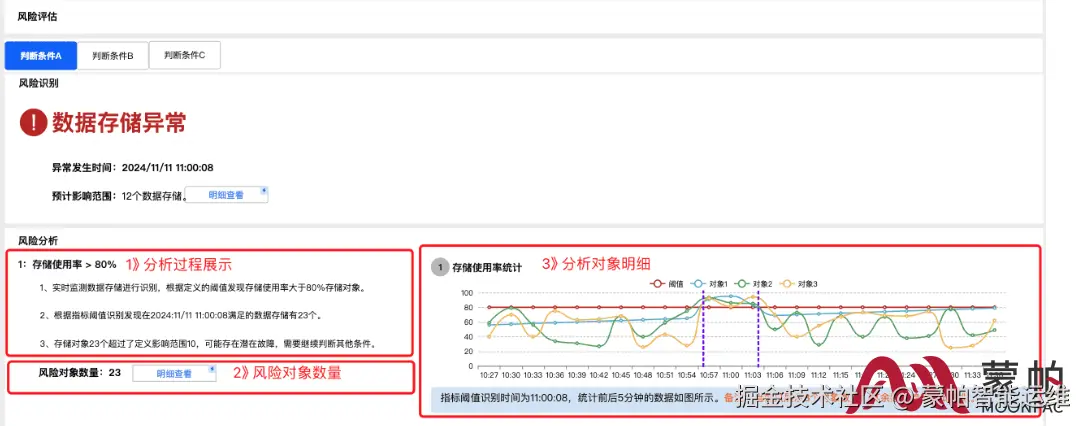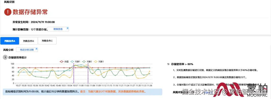 ● 分析过程展示: 针对当前障碍下满足判断条件中的指标进行风险分析,例如针对数据存储,判断条件中第一个指标定义存储使用率大于80%,第一条分析就是针对于存储使用率的分析过程展示。