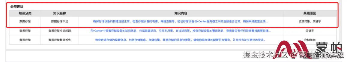 处理建议,根据当前障碍预防的资源类型对应知识库知识分类,知识名称对应知识名称,关联原因对应知识关键字,例如当前障碍为数据存储,按规范创建知识内容,进行映射关联。点击知识内容跳转至知识库查看知识详情。当前知识内容以知识库更新为准。