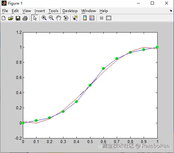 可以看到这里的蓝色曲线就是算出来的曲线,绿色的点是之前我们标记的参考点,可以看到蓝色曲线是大致符合,但是如果你需要精确的话,可能不太适合,比如我们查看对应 0 与 0.1 的 y 值,可以发现 0.1 比 0 的 y 值还低,如果要作为运动轨迹反映,那就是 0.1 的时候还比 0 的时候倒回一点距离,这就不合理的吧。