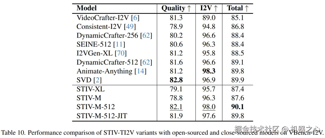 如表中所示,我们的模型在与最新方法的对比中表现出色。分析表明,尽管模型参数扩展提升了 I2V 分数,但对质量的影响较小。相比之下,提高分辨率能够显著改善质量和 I2V 分数。这一趋势表明,分辨率的提高对于提升多任务生成能力尤为关键。完整的分解维度结果见文章附录。