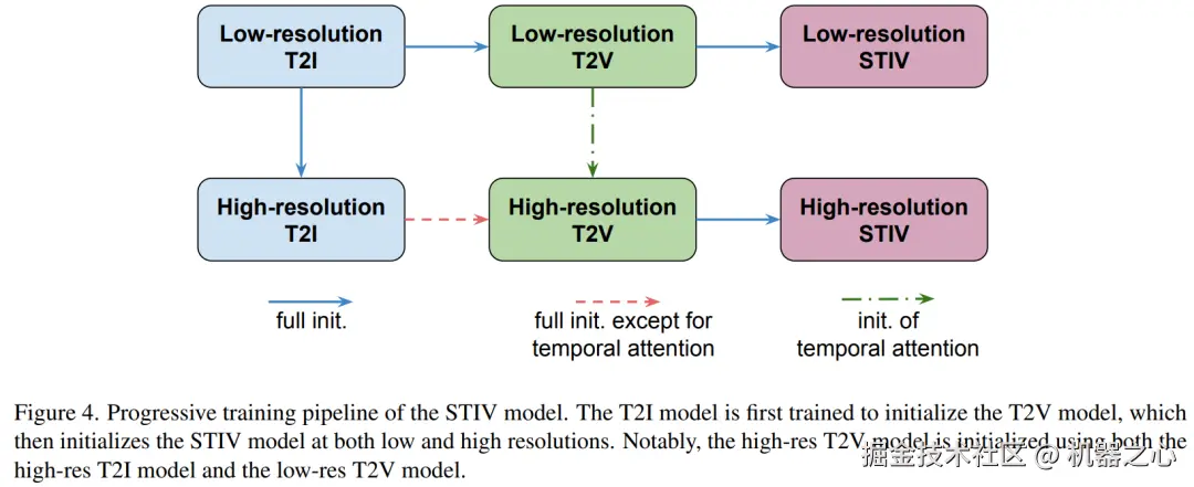 我们采用渐进式训练策略,其流程如图 4 所示。首先训练一个文本到图像(T2I)模型,用以初始化文本到视频(T2V)模型;随后,T2V 模型用于初始化 STIV 模型。为快速适应高分辨率和长时训练,我们在空间和时间维度中加入了插值的 RoPE 嵌入,并利用低分辨率、短时长模型的权重进行初始化。值得注意的是,高分辨率 T2V 模型同时结合了高分辨率 T2I 模型和低分辨率 T2V 模型的权重进行初始化。
