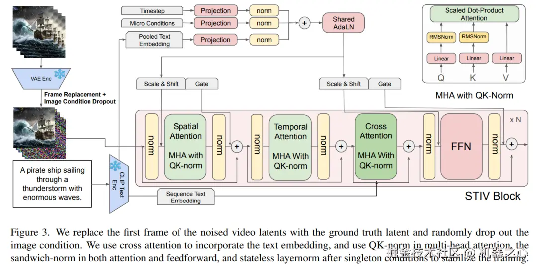 STIV 基于 PixArt-Alpha 架构,通过冻结的变分自编码器(VAE)将输入帧转换为时空潜变量,并使用可学习的 DiT 块进行处理。文本输入由 T5 分词器和内部训练的 CLIP 文本编码器处理。此外,该研究还对架构进行了以下优化: