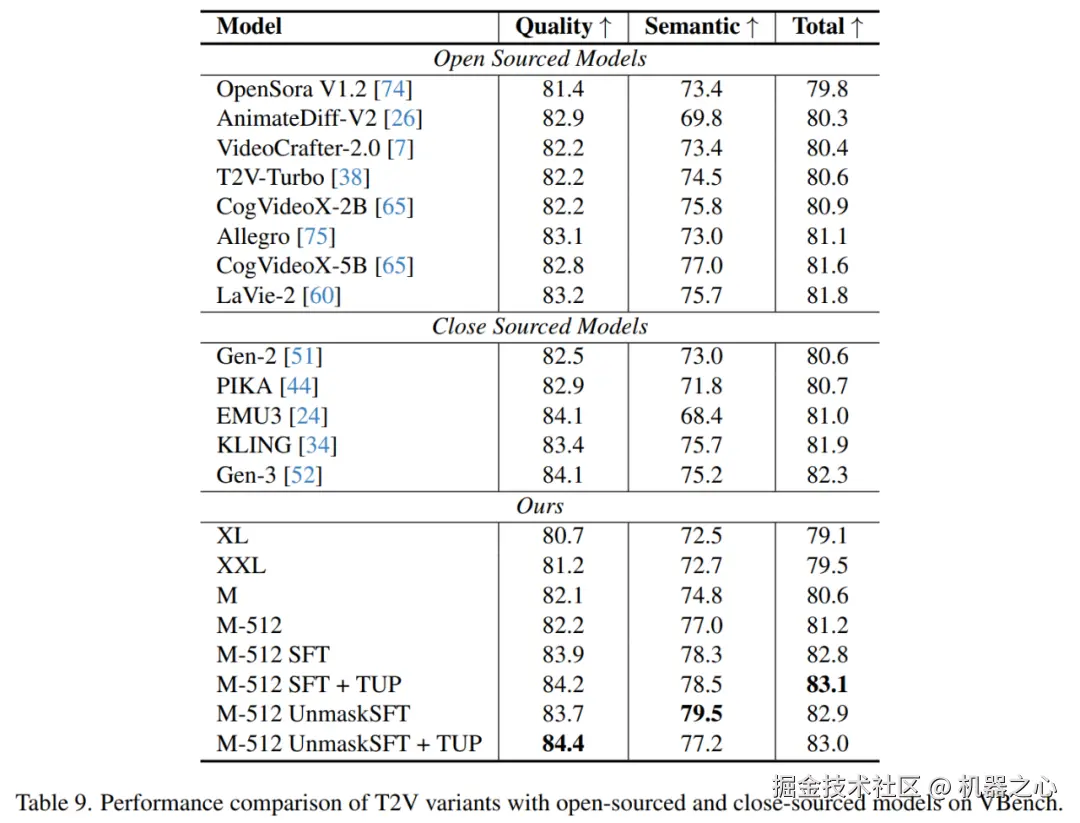 表格列出了不同 T2V 模型在 VBench 上的对比结果,包括 VBench-Quality、VBench-Semantic 和 VBench-Total 分数。分析表明,扩展 T2V 模型的参数能够提升语义理解能力。具体来说,当模型从 XL 增加到 XXL 和 M 时(三种模型尺度),VBench-Semantic 分数从 72.5 提升到 72.7,最终达到 74.8。这表明更大的模型在捕获语义信息方面表现更好。然而,对于视频质量的影响相对有限,VBench-Quality 仅从 80.7 提升至 82.1。这一发现表明,模型参数扩展对语义能力的提升大于对视频质量的影响。此外,将空间分辨率从 256 提升到 512 时,VBench-Semantic 分数显著提高,从 74.8 上升到 77.0。