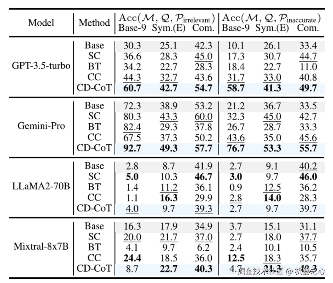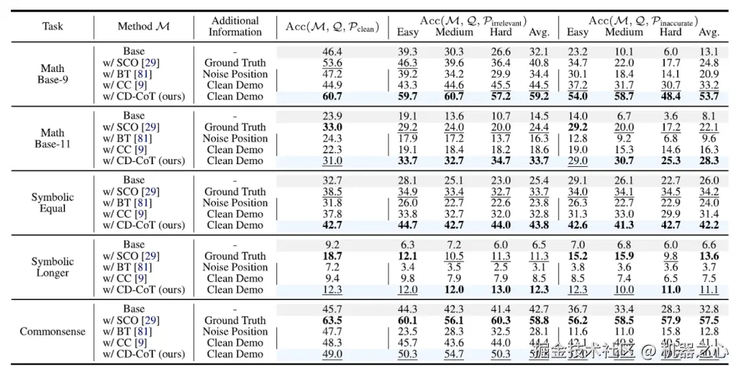 当面对噪声思维链时,与 base model 相比,CD-CoT 在所有数据集上的性能均有显著提升,准确率平均提升幅度达到 17.8%;
