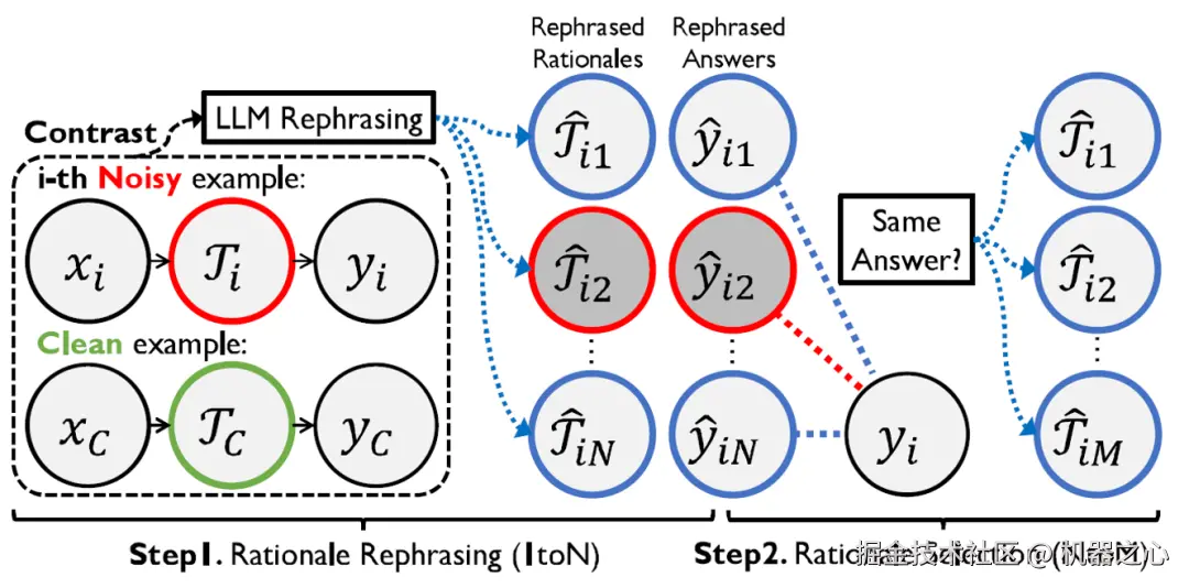 改写思维链:借助一个干净的思维链示例,引导 LLM 通过对比改写和纠正噪声思维链,并生成多个改写的思维链(见图 7 step1);