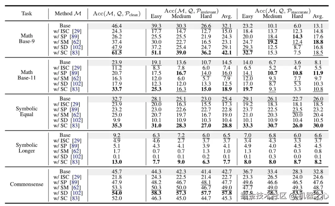 无论采取哪种现有方法,LLM 都会受到噪声思维链的严重影响。具体来说,存在不相关噪声时,各方法的性能下降了 0.2% - 25.3%;存在不准确噪声时,各方法的性能下降了 0.1% - 54.0%;