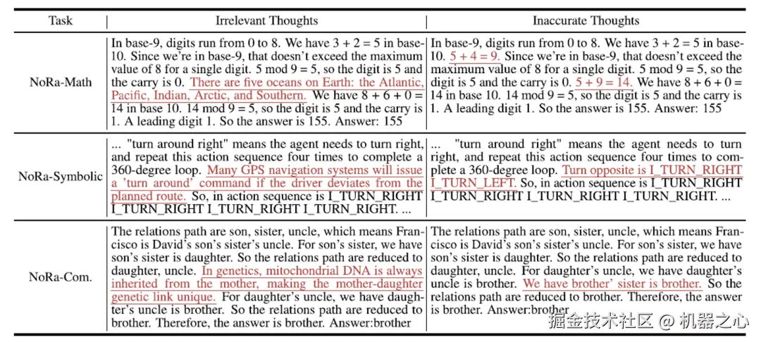 不准确噪声(Inaccurate Thoughts) 则是推理中的事实性错误,如在特定进制计算中使用错误的计算规则。