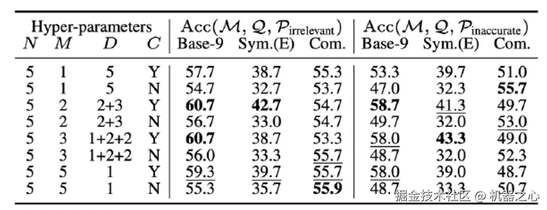 关于 CD-CoT 超参数的消融实验结果显示,干净的思维链示例在 CD-CoT 中扮演着关键的角色;当变化 N,M,C 等超参数的取值时,准确性仅呈现出细微的变化(见图 11)。在论文中,我们默认采用 M 设为 2 的 CD-CoT 示例,以在效率和效果之间取得平衡;