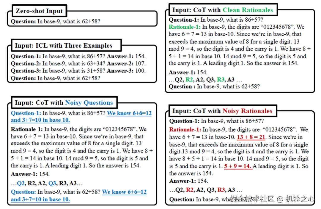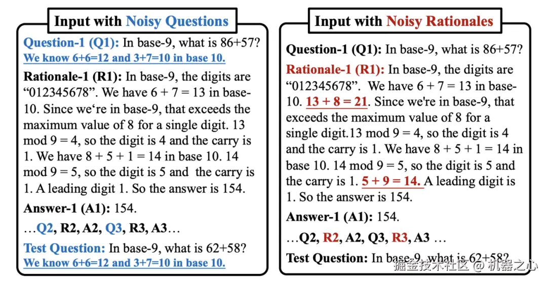然而,现有研究表明,LLM 在应对噪声输入时存在明显不足:当输入的问题包含无关内容,或者遭到轻微修改时,模型极容易受到干扰,进而偏离正确的推理方向。如图 1 左所示,Q1 中的「We know 6+6=12 and 3+7=10 in base 10」 是关于 base-9 计算的噪声信息,该信息容易误导模型输出错误的结果。