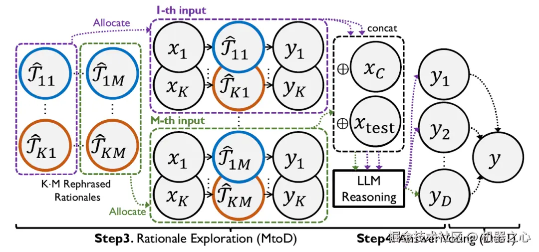 选择思维链:通过答案匹配,筛选出改写后答案不变的思维链,形成精炼的候选集;再从中随机选取一定数量的思维链,用于后续的推理(见图 7 step2);