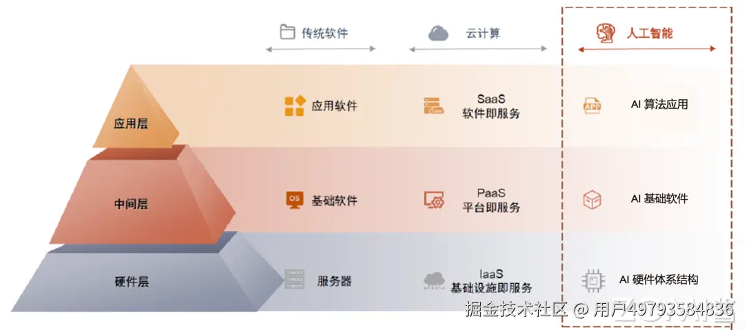 云时代同理,形成了 IaaS、PaaS、SaaS 三层架构,其中 PaaS 层提供应用开发环境和基础的数据分析管理服务。类比来看,我们认为,进入 AI 时代也有承担类似功能的、连接算力和应用的基础设施中间层即 AI 系统,提供基础模型服务、赋能模型微调和应用开发。