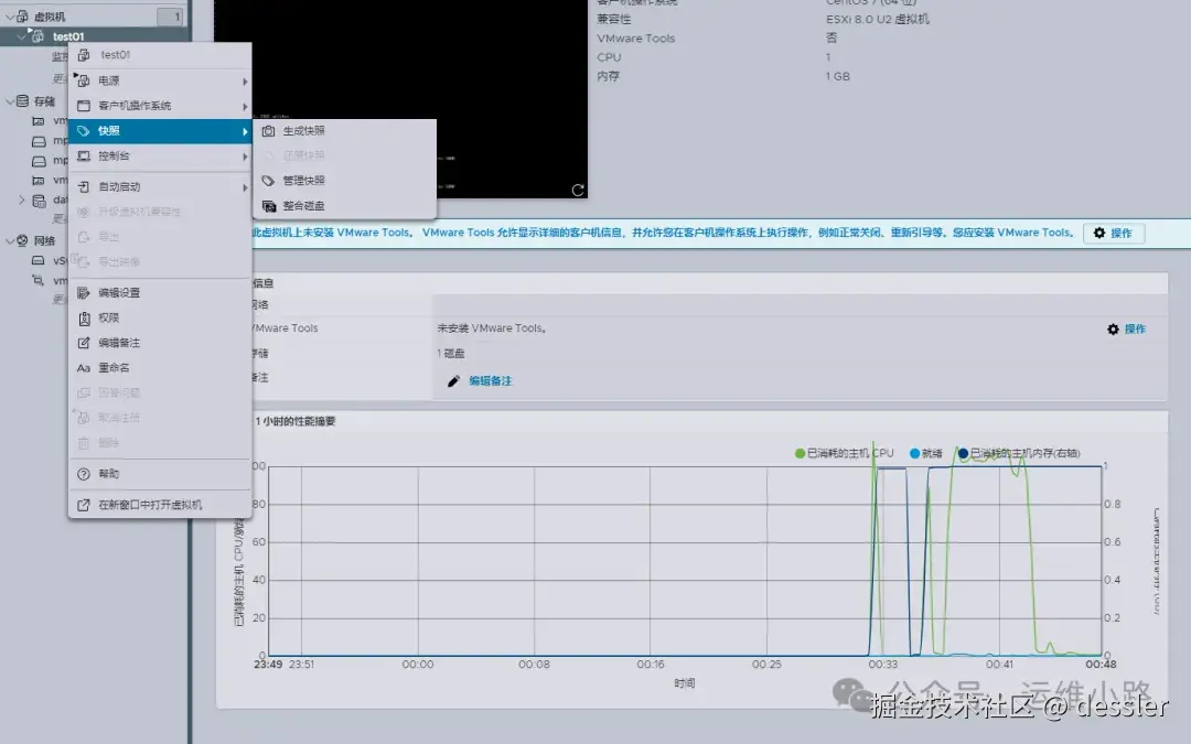 到这里我们可以看到一些这个虚拟机的监控信息,以及一些虚拟机的功能,比如快照,开机自启动等功能。