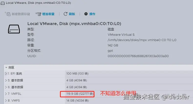 我在创建这个主机的时候,配置的是142G磁盘,但是安装完成以后的系统剩余120G左右。我尝试了多次均无法划分出来,所以又给它添加了一块磁盘,在我前公司做esxi的时候,这个系统是安装在u盘的里面,然后使用u盘启动,然后系统里面的正式的磁盘是作为数据盘。