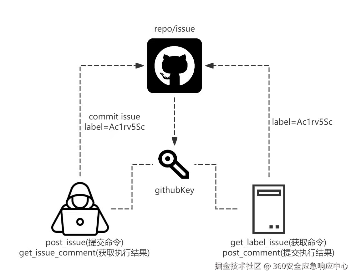 Github模块利用了github仓库自身的功能,巧妙的利用其功能特性,利用GitHub的Issue标签(labels)来区分上线主机,利用GitHub的Issue和Comment功能来下发命令和接收结果,implant通过调用GitHub API与私密仓库进行通信,攻击者利用Client可以直接对上线主机进行命令控制。