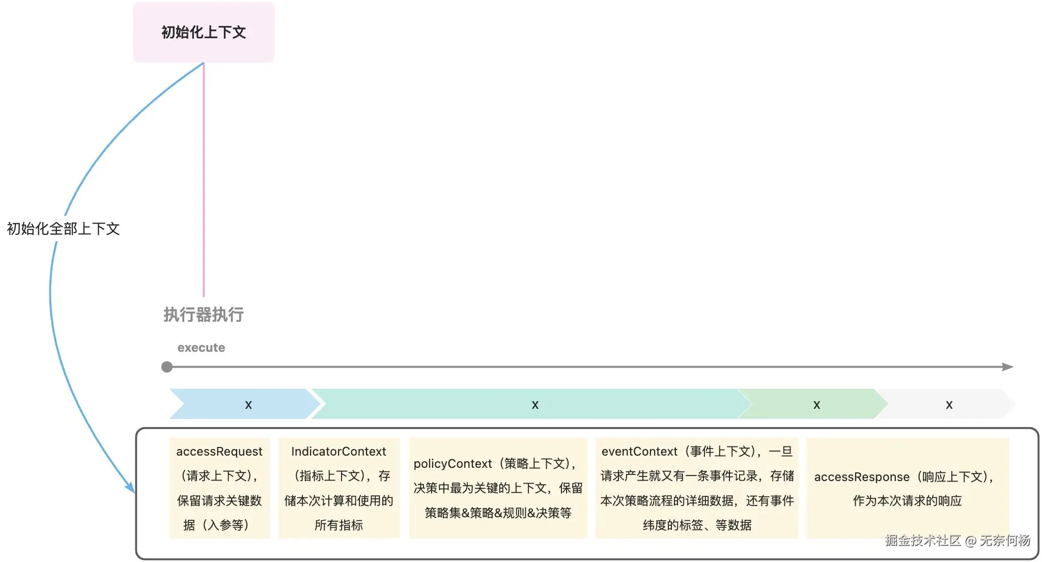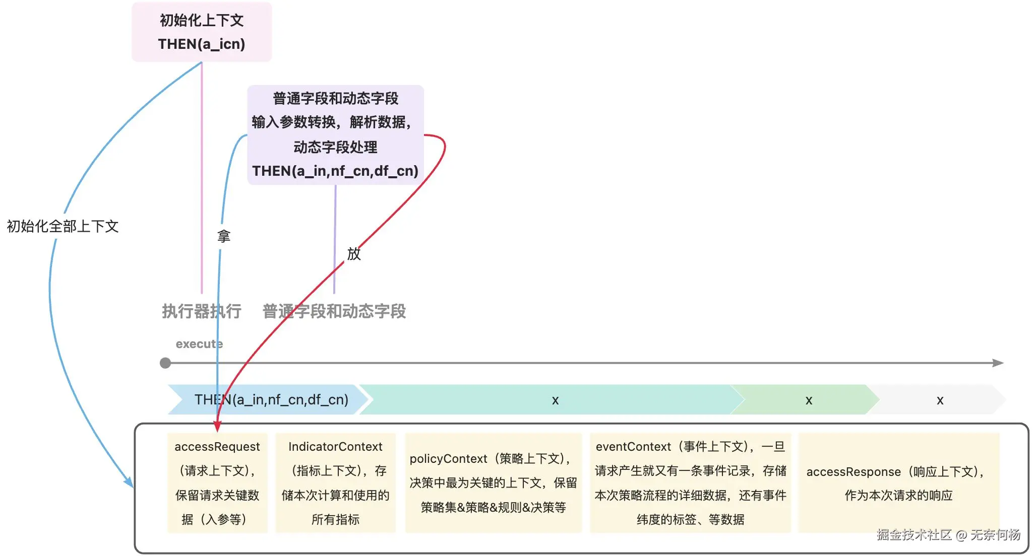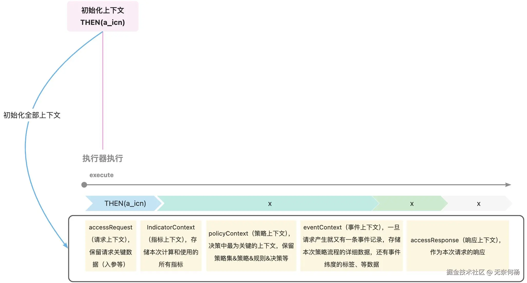 此时会拿accessRequest数据,判断执行哪个策略集,每笔请求只能执行一个策略集,然后将数据放在policyContext策略上下文和EventContext事件上下文中,之后执行策略集编排的EL,结束后整理数据再放accessResponse响应上下文中。