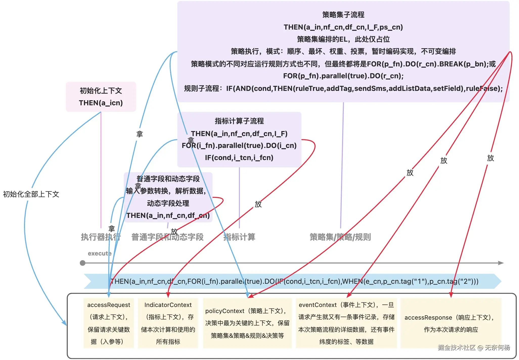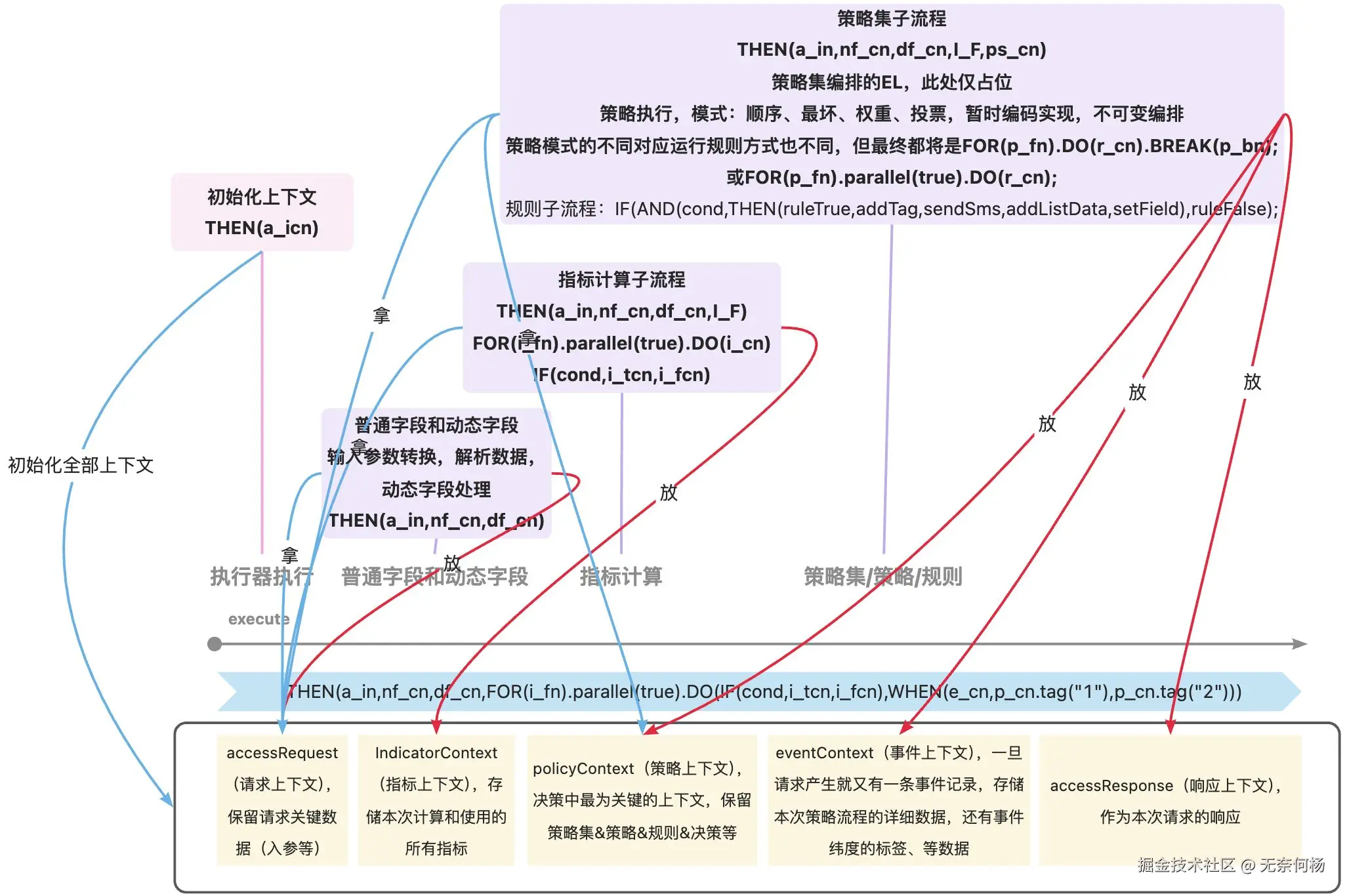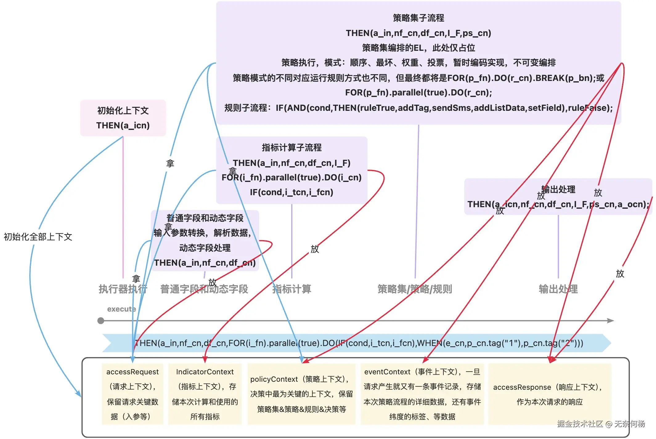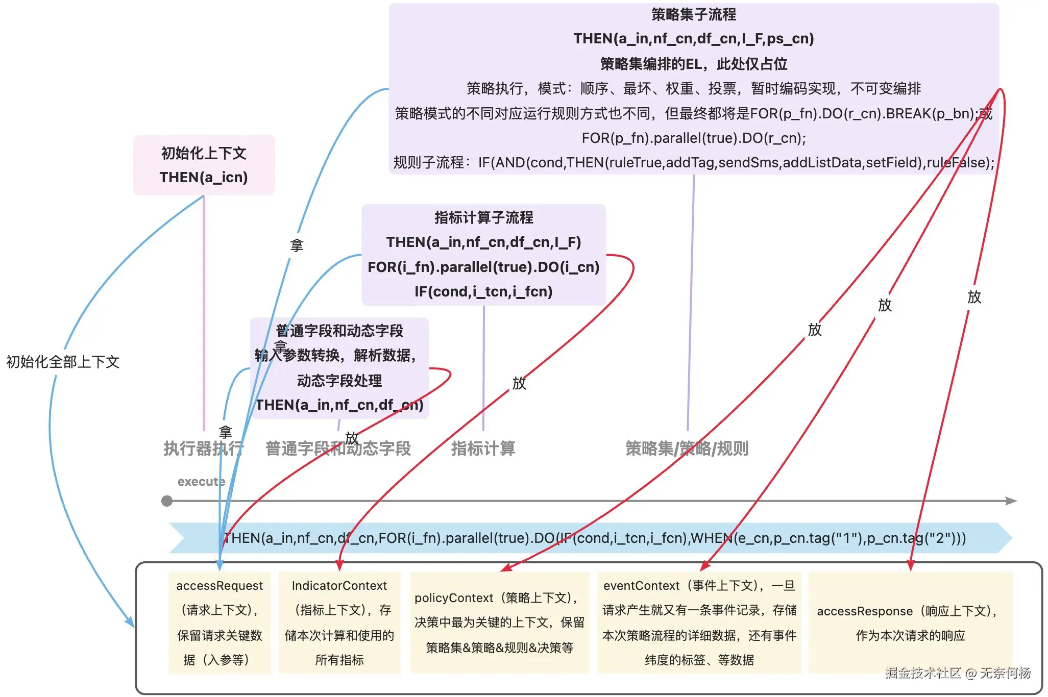 到此也还是在:THEN(a_in,nf_cn,df_cn,I_F,ps_cn),根据策略模式的不同执行FOR(p_fn).DO(r_cn).BREAK(p_bn);或FOR(p_fn).parallel(true).DO(r_cn);,r_cn表示规则组件也还是子流程,大概是:IF(cond,WHEN(ruleTrue,addTag,addList,sendSms,setFiled),ruleFalse),cond条件组件true则并行执行ruleTrue、addTag、addList、sendSms、setFiled,ruleTrue表示规则结果用于最终决策,除此之外都是可选项,addTag表示增加tag,addList表示添加名单,sendSms表示发送消息,setFiled表示设置字段。这些组件其实应该有更广的应用场景,但目前统一放在规则里,后续可能让其更具灵活性。这个步骤拿accessRequest和policyContext,放policyContext、accessResponse和EventContext。