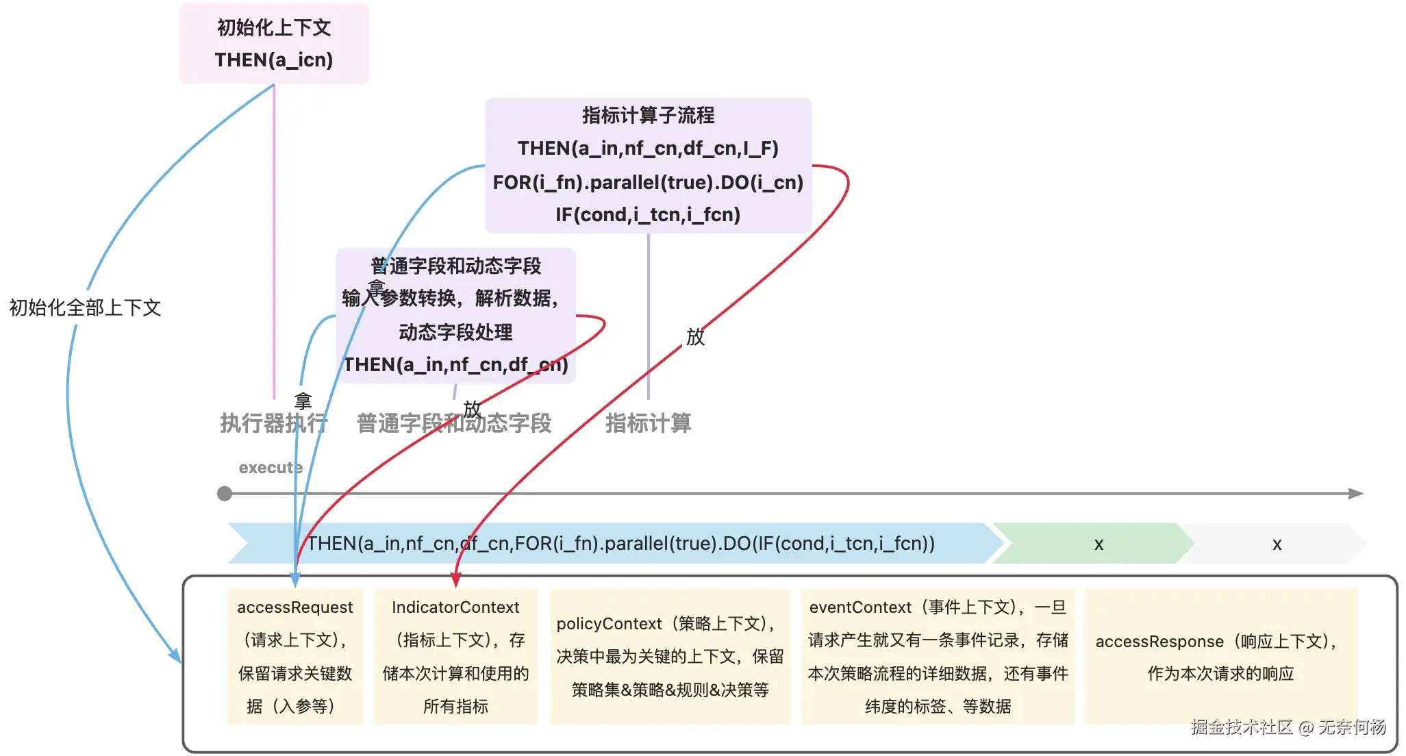到此大致执行了:THEN(a_in,nf_cn,df_cn,I_F),I_F不是通用的组件,实际上是一个子流程,表示指标计算,使用了循环编排。大概是这样的FOR(i_fn).parallel(true).DO(i_cn);,i_fn表示指标计算循环次数组件,通过拿accessRequest查询满足本次请求场景的指标集合,然后并行运行这些指标组件i_cn,其也是个子流程,大概是IF(cond,i_tcn,i_fcn),指标组件首先通过cond条件组件判断是否满足本条指标条件,满足则执行i_tcn组件计算指标,不满足则执行i_fcn,最后将结果设置到IndicatorContext指标上下文中。