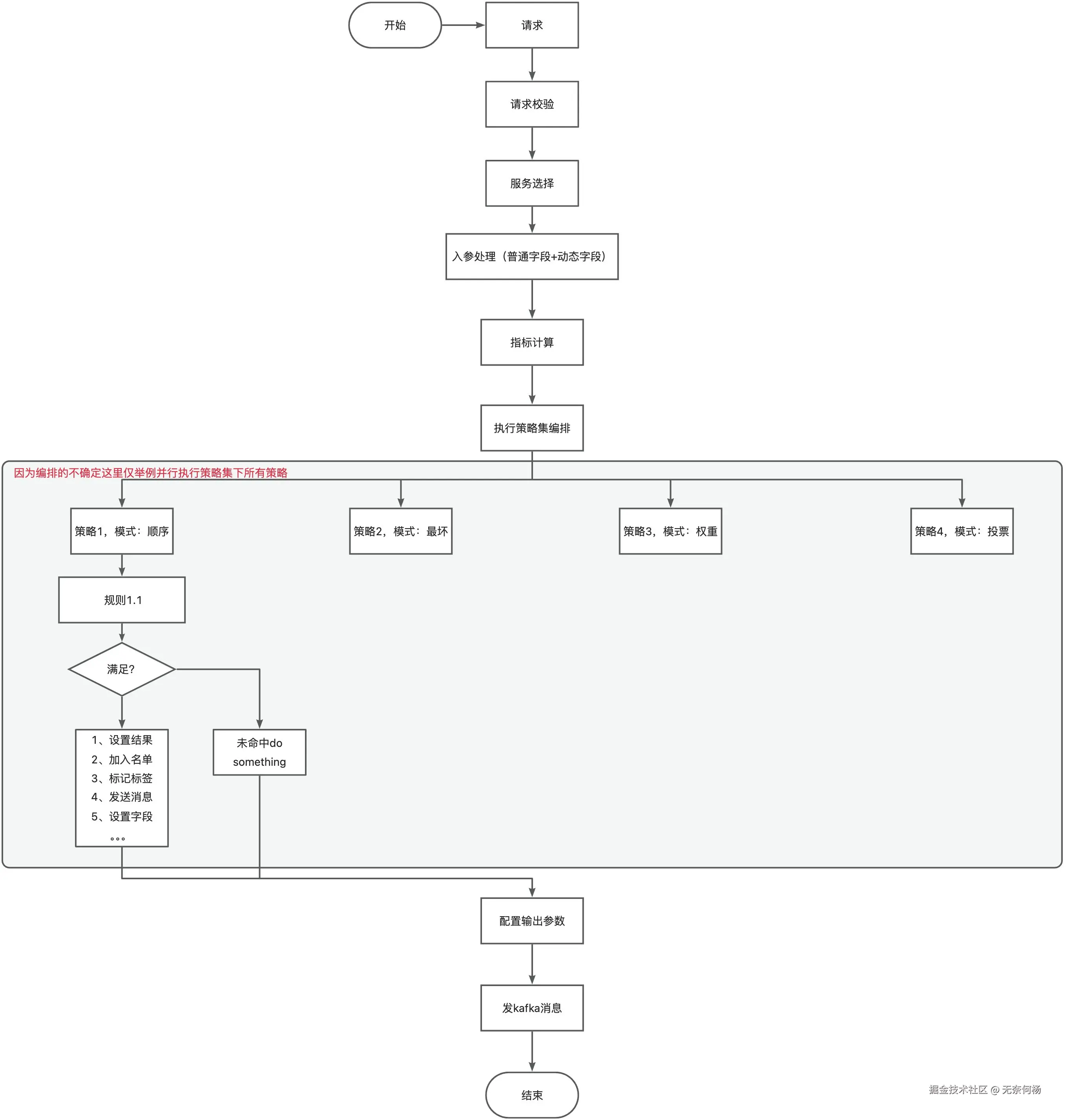 到此大致执行了:THEN(a_in,nf_cn,df_cn,I_F,ps_cn),ps_cn是策略集组件是编排的关键,默认会有并行执行和串行执行策略集下所有策略,当然后面会加入其他丰富的内容,如:A/BTest、冠军挑战、三方、模型之类的吧,还在构思。所以先占位吧大概是WHEN(e_cn,p_cn.tag("1"),p_cn.tag("2"));这种的吧。