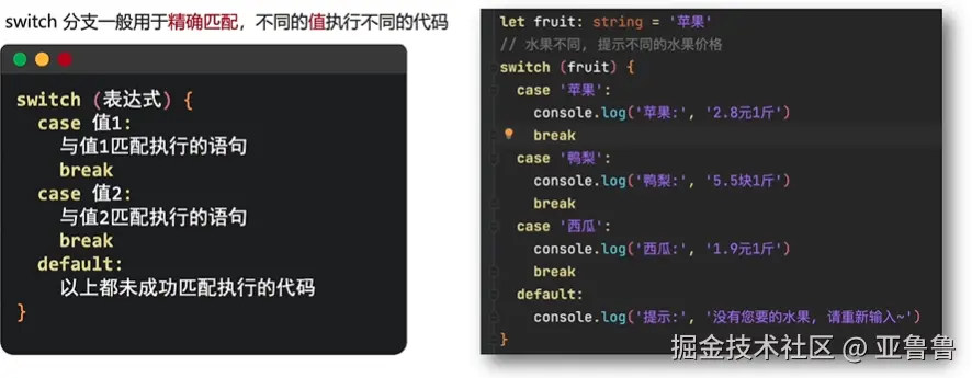 switch分支一般用于精确匹配, 不同的值执行不同的代码