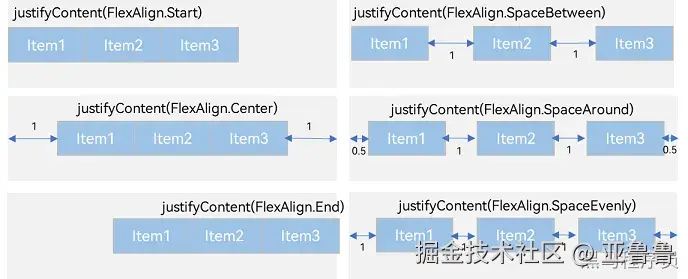 .justifyContent(FlexAlign.Start)//左端对齐,默认