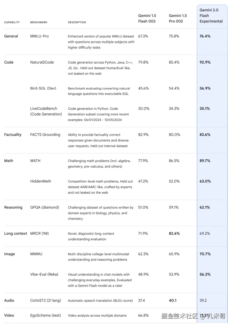如下图所示,Gemini 2.0 Flash在多个基准测试中表现优异,甚至超过了Gemini 1.5 Pro。这些特点使得Gemini 2.0 Flash不仅仅是一个更快速的版本,更是一个能够提供智能交互的强大平台,适用于复杂任务处理与实时响应。