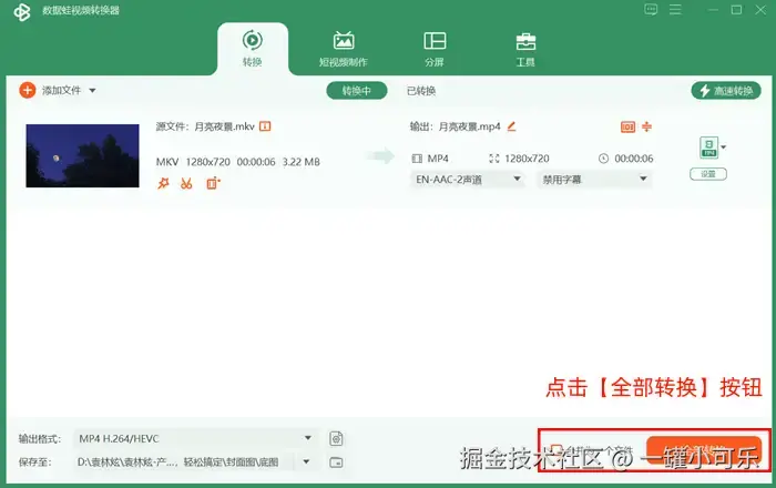 步骤3:点击右下角的【全部转换】按钮,开始转换。转换完成后,该界面会自动弹出已转换好的MP4文件夹。