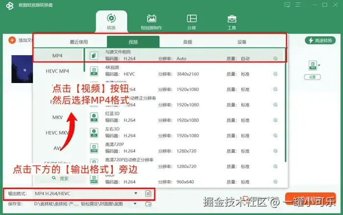 步骤2:点击下方的【输出格式】旁边的选择框,进入视频格式选择界面之后,点击界面上方的【视频】按钮,然后选择MP4格式。