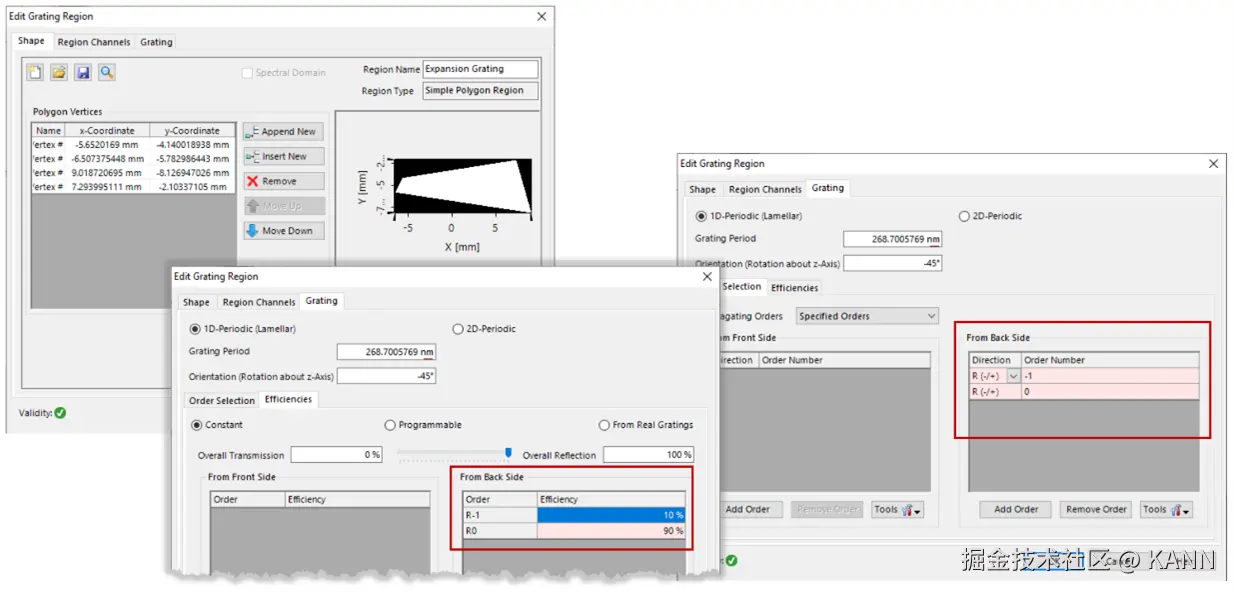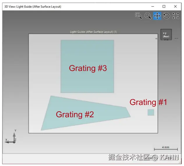 摘要 目前,大多数创新的增强和混合现实设备都是基于光波导或波导配置,并结合微观结构来耦合光的进入和输出。VirtualLab Fusion技术能够通过应用我们独特的物理光学方法对这些器件进行详细的建模,其中包括所有感兴趣的影响因素(如相干性、偏振和衍射)。我们通过建立一个简单的“HoloLens 1”型(1D-1D出瞳放大器)布局模型来演示这种能力,该设备能够在32°×18°的视场下引导光传输。 建模任务 光波导的工作原理 光波导使用内部全反射(TIR)来“捕获”光波导板内的光。为此,采用光栅耦合入射和出射光,并确保满足内部全反射条件。 出瞳放大光栅的功能是在某一个方向上(这里是x方向)复制耦合的光瞳,以扩散出瞳,或者换句话说生成人眼观察区域。在这种类型的设置中,输出耦合光栅不仅负责将光输出耦合到观察者,而且还负责光瞳在第二个方向(这里是y方向)的扩散。这种分离式的光瞳扩散是“HoloLens 1”型布局的特征。 布局设计工具为了设置这种光波导的横向布局,可以使用VirtualLab的Layout Design工具(仅在光波导工具箱中可用)。此使用案例的参数对应于默认配置。该工具根据给定的规格的入射光和人眼观察区域提供了一个光波导的光学参数设置。特别注意的是,光栅区域的横向位置和延伸以及光栅周期都是自动设置的。定义参数后,单击“创建结果”按钮,然后会创建出光学参数设置和相应的k布局图。 查看k布局k布局图可以与光波导系统一起作为布局设计工具的副产品创建,也可以通过菜单中的条目独立生成。可以配置以下参数:波长;环境和平板的材料;视场角范围;光栅周期和方向。结果图包含以下信息(在k域中): 描述材料内部传播条件的圆(可用方向和k值)。在某些光栅区域后入射光和衍射光的视场延伸、形状和位置。由光栅引入的视场位移的说明。 任何参数的调整都会相应地改变图像。 光波导表面布局几何布局显示了第一平面表面上的3个光栅: 光栅#1:耦入光栅光栅#2:扩散光栅光栅#3:耦出光栅 光栅#1:输入光栅 耦入光栅被定义在一个矩形区域内。定义光栅区域的一般工作流程是: 1. 确定区域的形状和直径;2. 选择区域通道;3. 定义光栅的周期和方向;4.指定传播级次(从正面和背面);5.指定透射效率和反射效率。 光栅#2:简单多边形区域中的扩散光栅 扩散光栅被定义在一个多边形形状的区域中。所需区域通道为‒//+,因此只指定照射到光栅背面的光的反射级次。 光栅#3:输出光栅输出耦合光栅被定义在一个矩形区域内。区域通道‒/+和‒/‒需要激活负责扩散和输出耦合的级次。 结果:三维系统中的光线追迹 有视场中心角度的系统视图光线: 32°×18°扫描光源(9种模式,不同颜色)输入的系统视图光线: 结果:场追迹(真实颜色视图) 结果:场跟踪(伪颜色视图) 横向均匀性评价 为了评估人眼观察区域内的横向均匀性,提供了均匀性检测器,它可以在元件列表中找到(在探测器(Detectors)>评价函数(Merit Functions)>均匀性检测器下(Uniformity Detector)。该探测器能够研究在特定位置的特定区域(如人眼观察区域)的横向能量密度分布。  |