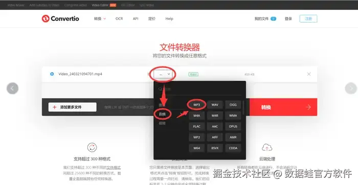 步骤一:怎么把mp4转换成mp3格式?启动您的浏览器,导航至Convertio的官方网页。然后,点击醒目的红色方框标记的【选择文件】按钮,上传您希望转换的mp4视频文件。